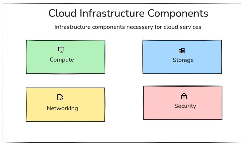 Cloud infrastructure consists of four components. These all work together to deliver flexible, secure, and efficient computing resources: