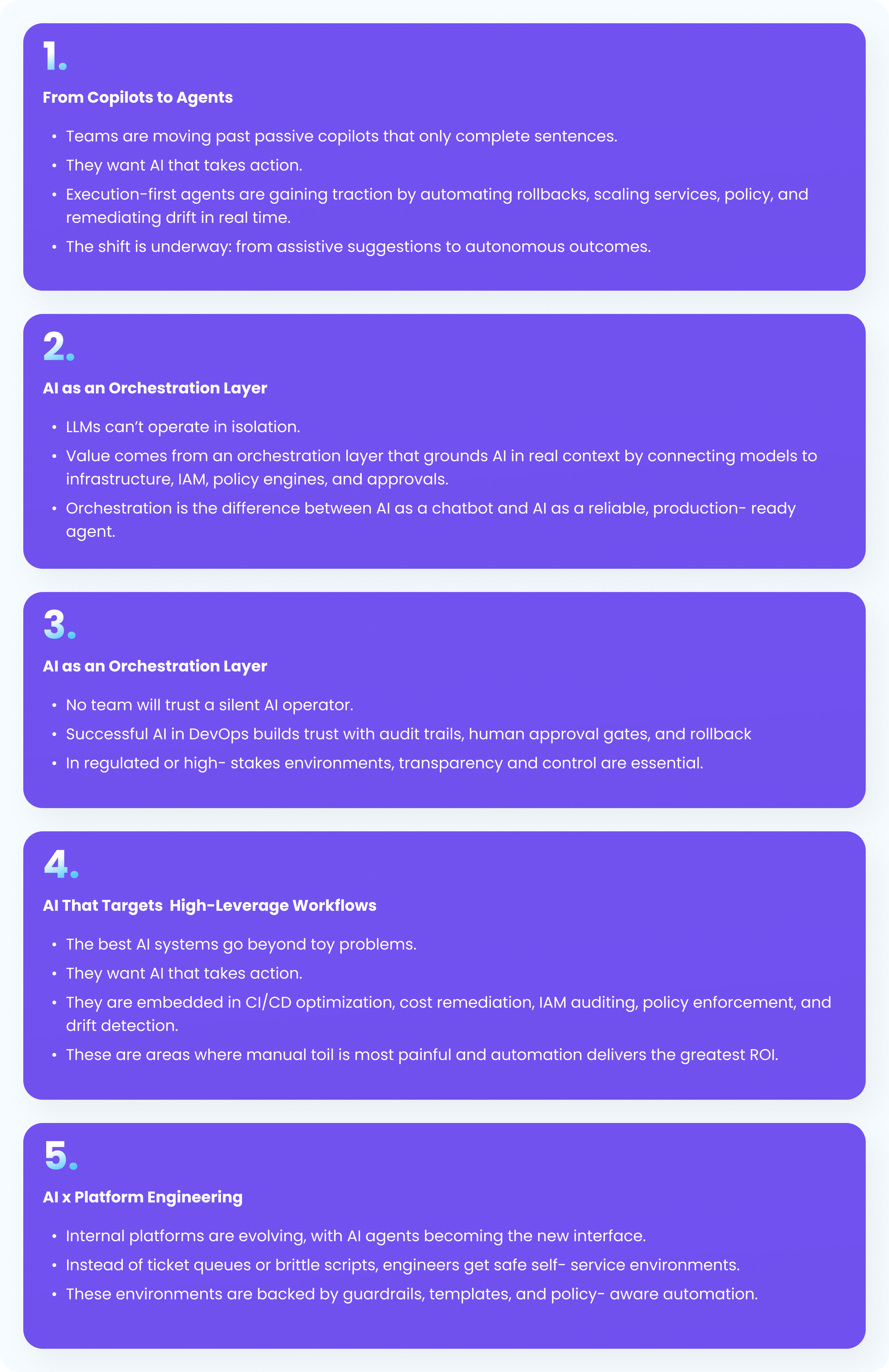 2025 has been the year of agents. Teams are no longer settling for scripts or static workflows. They’re trying out agentic systems that observe, decide, and act in real time. These AI agents are infrastructure-aware and persistent, handling everything from provisioning and drift remediation to policy enforcement and ticket resolution. It’s a shift toward automation and intelligent execution.