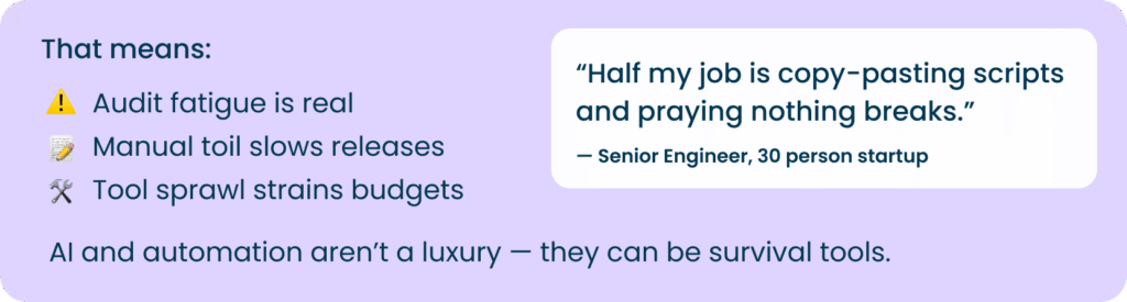 - Security & compliance top the pain list. Over 60% say it’s their #1 challenge—and it’s still handled manually in most orgs.